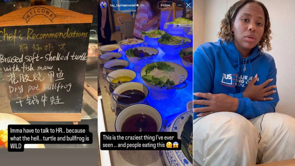 湯森德在參加深圳賽事晚宴時,透過Instagram發布一系列影片,對于自助餐桌上的青蛙、鱉和海參等食材感到震驚,對雞胗、雞心等內臟類食材相當卻步,并稱這些料理“太瘋狂了”,自己只敢吃面食,而且對中國料理打出2分(滿分10分)的低分。