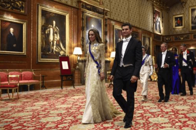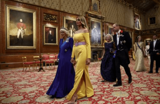 不過,美國第一夫人梅拉尼婭的服飾成為更大話題。她當晚穿上一襲亮黃色露肩禮服,配以粉紅色腰帶與藍色耳環。有網民指其造型像“春季郊游服”,“根本不象是來出席王室國宴的樣子”。反觀英國王室成員盛裝出席,凱特王妃身穿英國設計師Phillipa Lepley訂制的香檳金法式蕾絲長袍,內襯絲絨裙裝,頭戴已故英女王摯愛的“戀人之結”鉆石王冠,并佩戴查爾斯三世與伊麗莎白二世的家族勛章。王后卡米拉則身穿皇藍色絲綢繡花長裙,佩戴鉆石藍寶石冠冕。