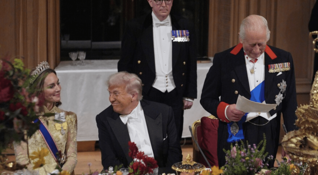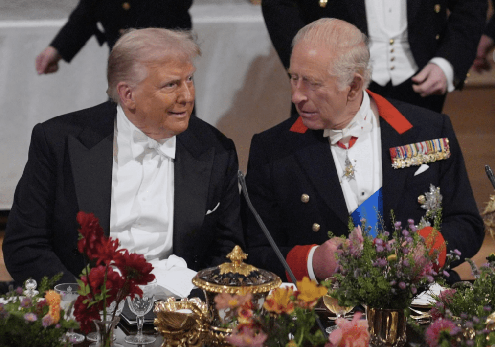 英王查爾斯三世在溫莎堡舉行國宴歡迎特朗普到訪,出席嘉賓冠蓋云集。查爾斯與王后卡米拉親自迎接特朗普夫婦,威廉王子與凱特王妃亦在場協助接待。英王室安排特朗普與查爾斯一同乘坐愛爾蘭國家馬車進入皇宮,沿途經過儀仗兵列隊致敬,紅毯鋪地、英軍奏樂、空軍特技隊“紅箭”飛過天際噴出紅白藍煙霧,場面盛大。