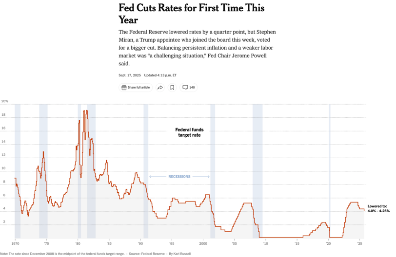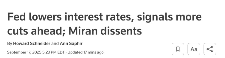 從2024年9月18日降息50個基點的大幅急轉,到2025年9月17日降息25個基點的謹慎試探,這不僅反映出經濟形勢的演變,也折射出美聯儲在政治與市場夾縫中的平衡術。前一次是對經濟硬著陸風險的緊急回避,這一次則是在就業壓力與政治干預陰影下的小心調整。對市場與全球而言,這不僅是一次關于利率的技術決策,更是一場關于央行獨立性與政策可信度的深層博弈。