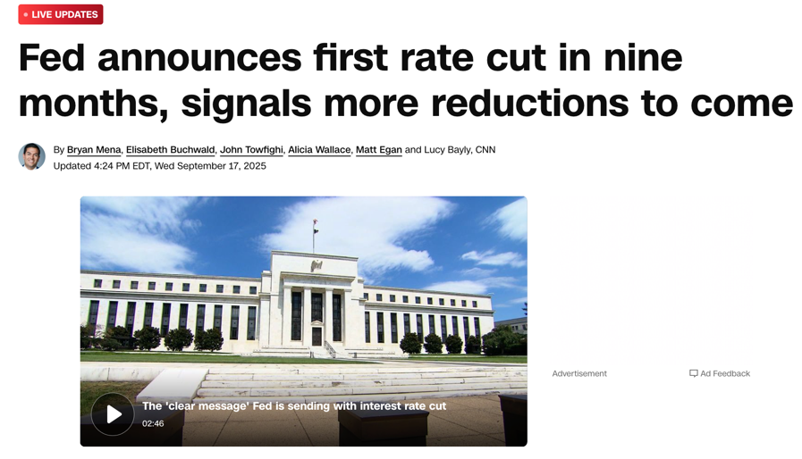 ▲CNN報道,美聯儲9個月來首次宣布降息