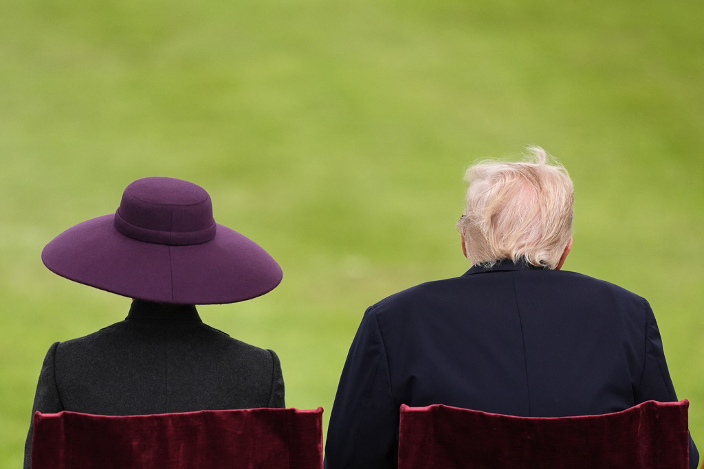2025年9月17日,美國總統特朗普與第一夫人梅蘭妮亞坐在溫莎城堡東草坪的主席臺上,觀賞“退伍軍樂”軍事儀式,這是特朗普第二次進行英國國是訪問的一部分。
