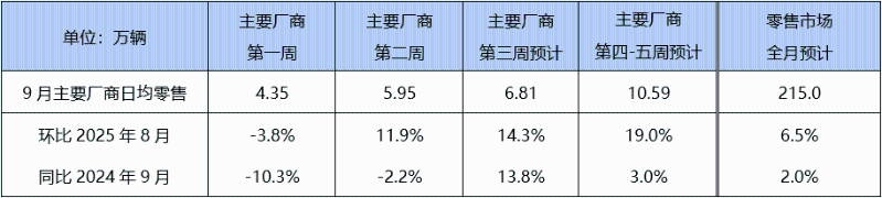 9月第一周,受開學季及部分政策細則落地節奏的影響,市場熱度階段性回落,日均零售4.35萬輛,同比-10.3%,環比-3.8%。第二周起,多地購車補貼全面啟動,疊加廠商借“金九”之際加大促銷力度,日均零售回升至5.95萬輛,同比-2.2%,環比增長11.9%。第三周市場持續回暖,日均零售預計可達6.81萬輛,同比增長13.8%(去年同期受中秋假期影響基數較低),環比增長14.3%。第四周進入沖擊廠商季度目標的關鍵階段,日均銷量預計可達10.59萬,同比3.0%,環比19.0%。全月零售總市場預計可達到215萬輛左右。