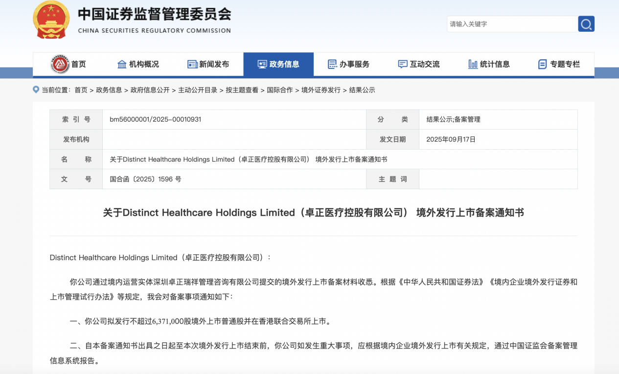 9月17日,中國證監會國際合作司發布關于卓正醫療控股有限公司(以下簡稱:卓正醫療) 境外發行上市備案通知書。