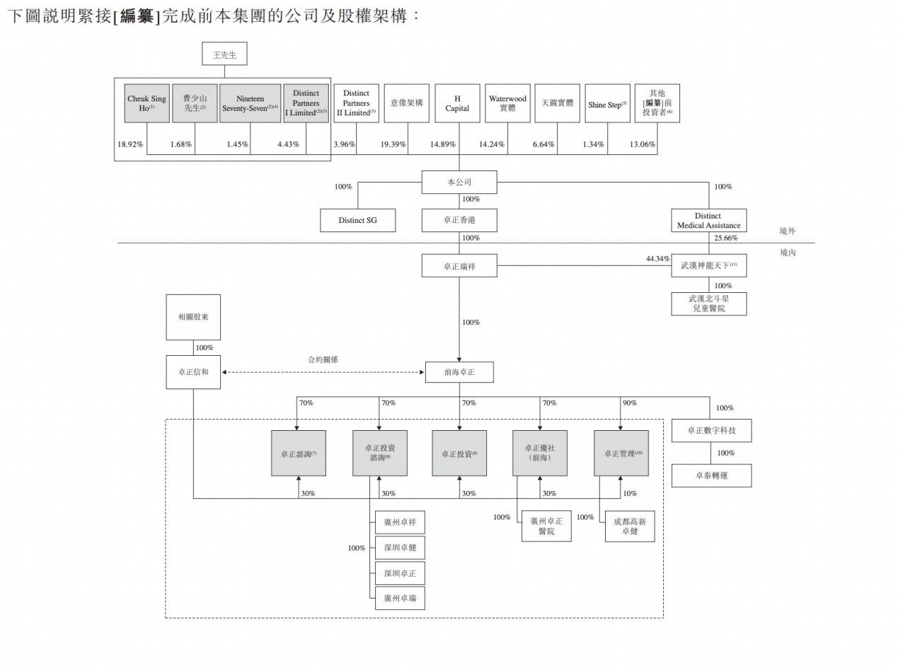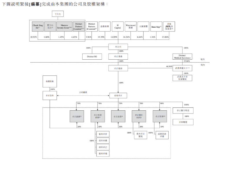 IPO前,王志遠為卓正醫療最終單一最大股東,能夠通過一致行動協議、 Cheuk Sing Ho協議及Distinct Trust I的信托契據行使合計26.48%的投票權。