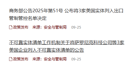 • 商務部出手!3家美國實體列入出口管制管控名單,3家美國企業列入不可靠實體清單