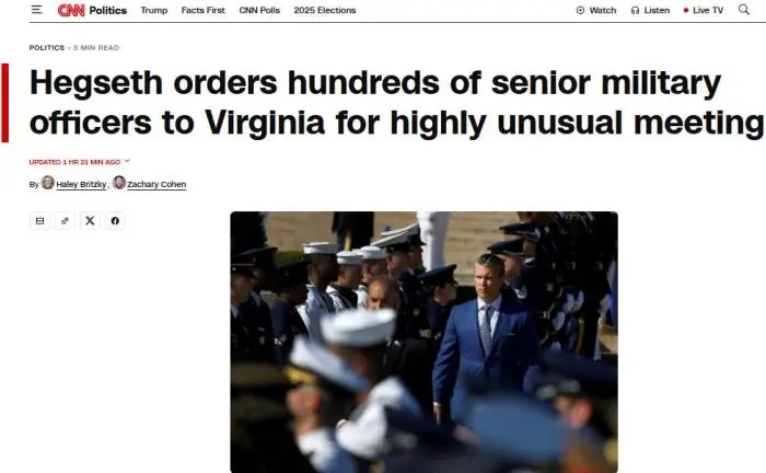 據CNN報道,數百名美國高級軍官將于9月30日與赫格塞思舉行會議,會議預計將在弗吉尼亞州的一個軍事基地舉行。