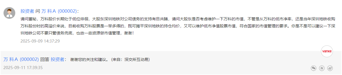2025年9月9日,有投資者向萬科董秘提出,希望建議大股東深鐵集團不要只管債務兜底,也放一些資源做市值管理。該人士認為,萬科當下市凈率較低,同時深鐵當年收購萬科的股價溢價頗高,目前增持萬科股票實屬一舉多得,既可平攤深鐵的持倉均價,又可以維護股票市值,符合國家關于市值管理的導向。
