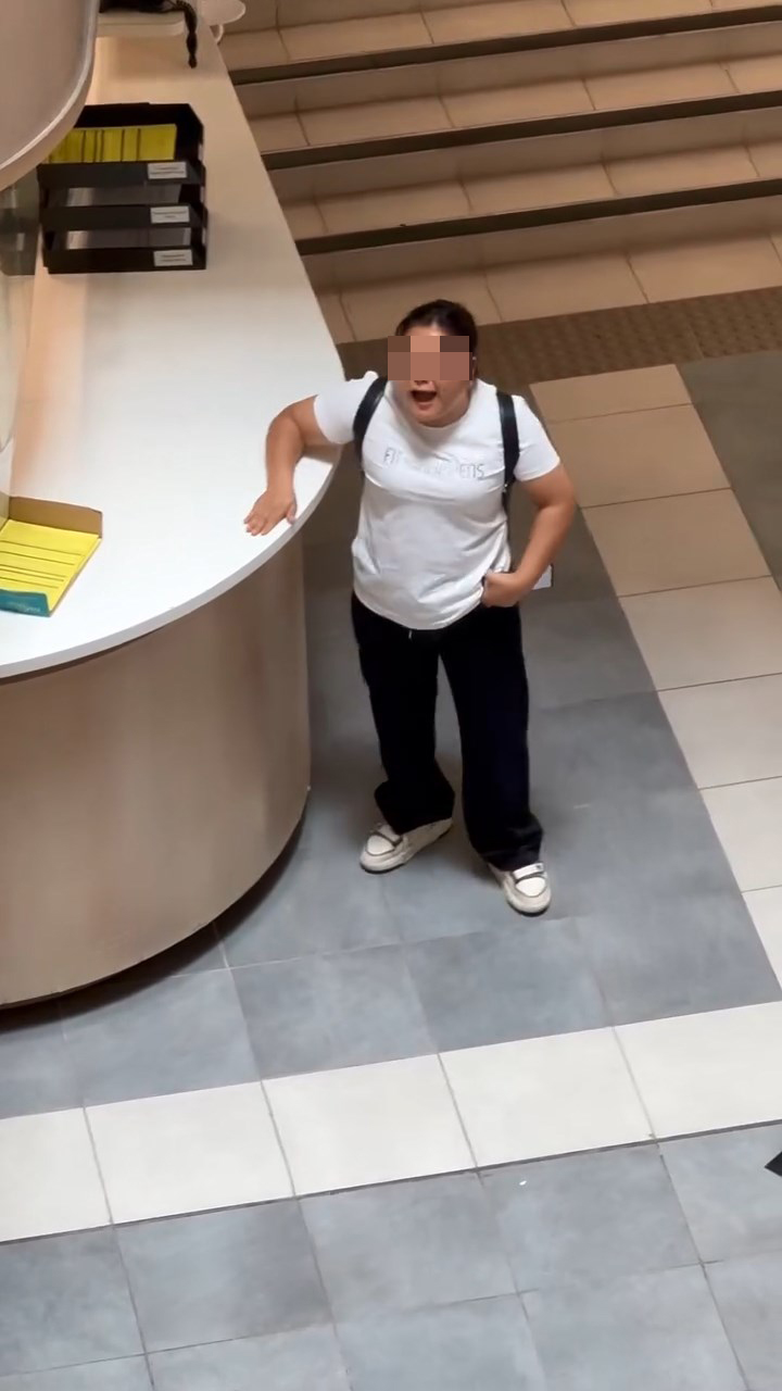 女子不斷拿起柜枱的單張不停拍打枱面及玻璃。k