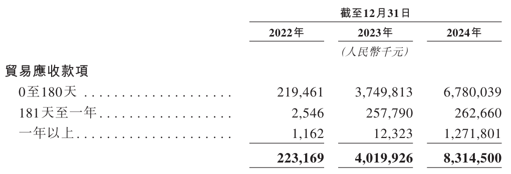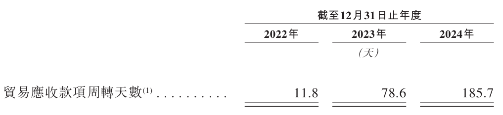 據此計算,海辰儲能2024年的貿易應收款項占其總收入的比例高達69.5%,這也意味著該公司收入金額中有近七成將被用作賒賬。同時,海辰儲能的應收賬款周轉天數也由2022年的11.8天延長至2024年的185.7天,回款風險高企。