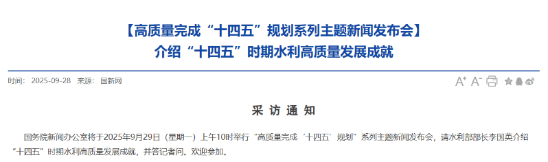國務院新聞辦公室將于2025年9月29日(星期一)上午10時舉行“高質量完成‘十四五’規劃”系列主題新聞發布會,請水利部部長李國英介紹“十四五”時期水利高質量發展成就,并答記者問。