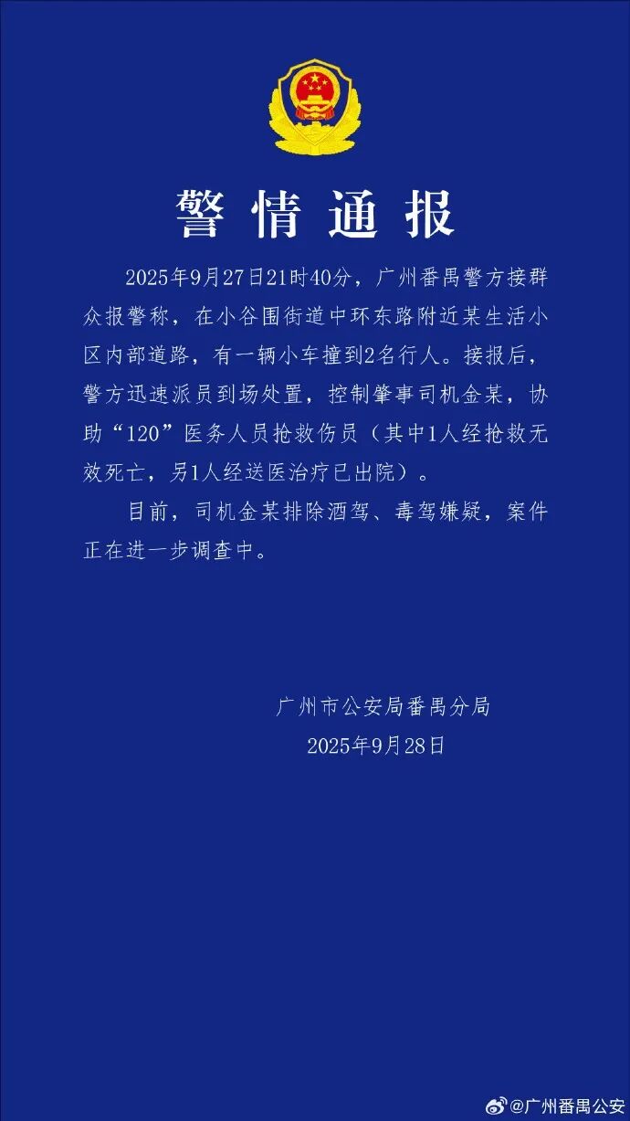 據澎湃新聞,廣州市公安局番禺分局昨(28日)晚通報一宗交通事故:9月27日晚9時40分,廣州番禺警方接群眾報警稱,在小谷圍街道中環東路附近某生活小區內部道路,有一輛汽車撞到2名行人。接報后,警方迅速派員到場處置,控制金姓肇事司機,醫務人員搶救中證實,1人搶救無效死亡,另1人經送醫治療已出院。目前,肇事的金姓司機排除酒駕、毒駕嫌疑,案件正在進一步調查中。