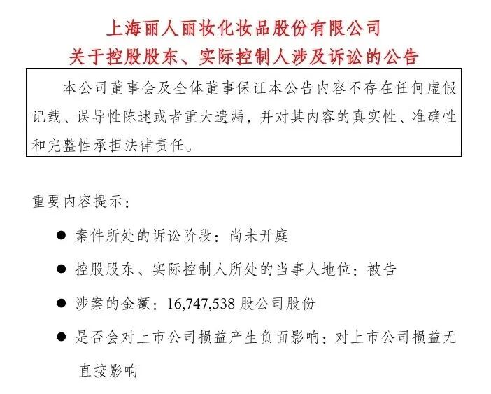 9月29日,麗人麗妝(605136.SH)發布公告稱,控股股東、實際控制人黃韜因涉及離婚后的財產糾紛,收到上海市徐匯區人民法院的舉證通知書及應訴通知書,成為被告。