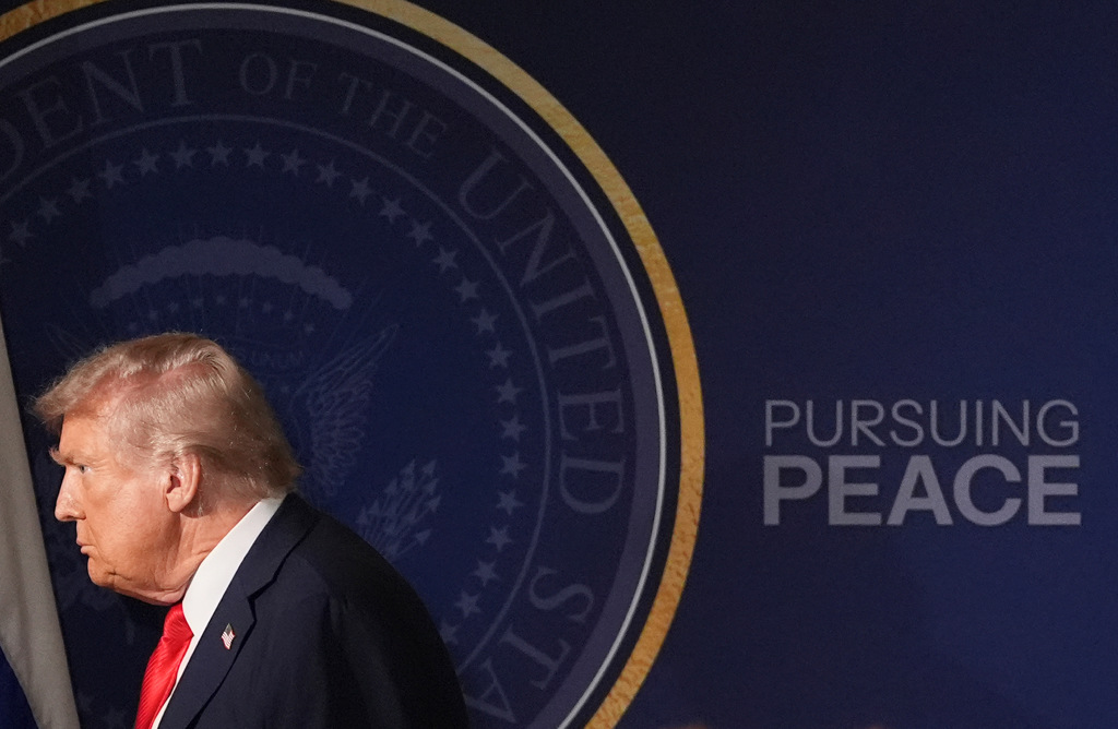 ▲美國總統特朗普今年8月15日在阿拉斯加州與俄國總統普京舉行歷史峰會,聯合記者會現場布置背板寫了“追求和平”字樣。 然而俄羅斯侵略烏克蘭的戰爭打了超過3年半仍未停止。 (資料照/美聯社)