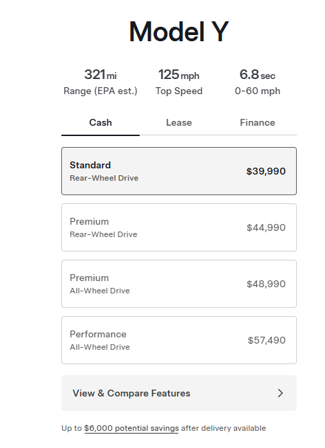 其中,Model Y標準版續航里程從357英里下降至321英里,19英寸輪轂改成18英寸輪轂,可花1500美元選裝19英寸輪轂。