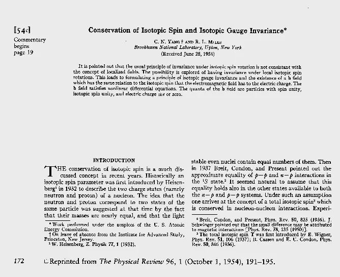 1954年楊振寧與米爾斯關于“非阿貝爾規范場”的論文