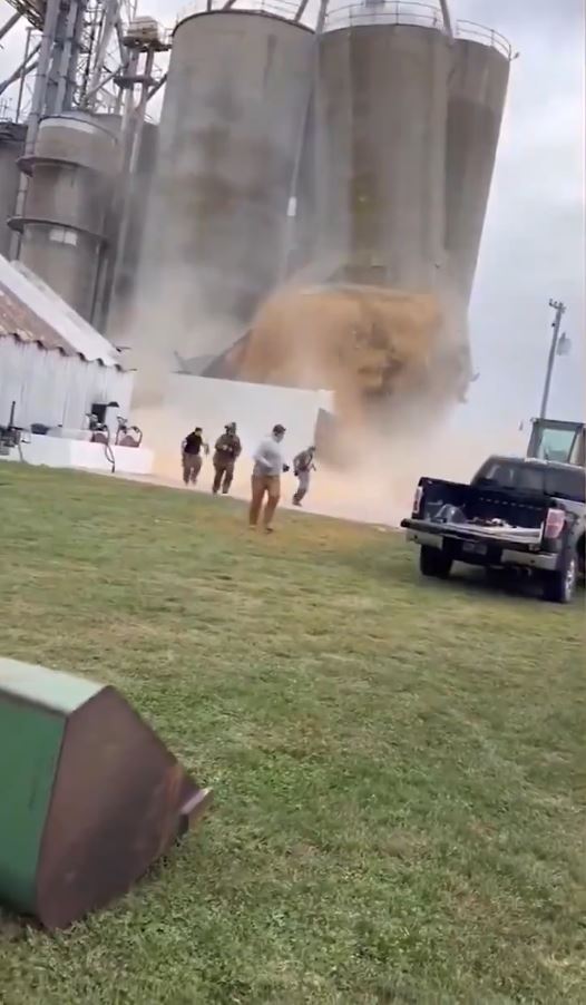 網上流傳影片可見,涉事的水泥巨型谷倉,疑因積存大豆過多,數層樓高的谷倉壁,先是慢慢開裂,露出鋼筋,然后倉內大豆壓破墻壁,傾瀉而出。