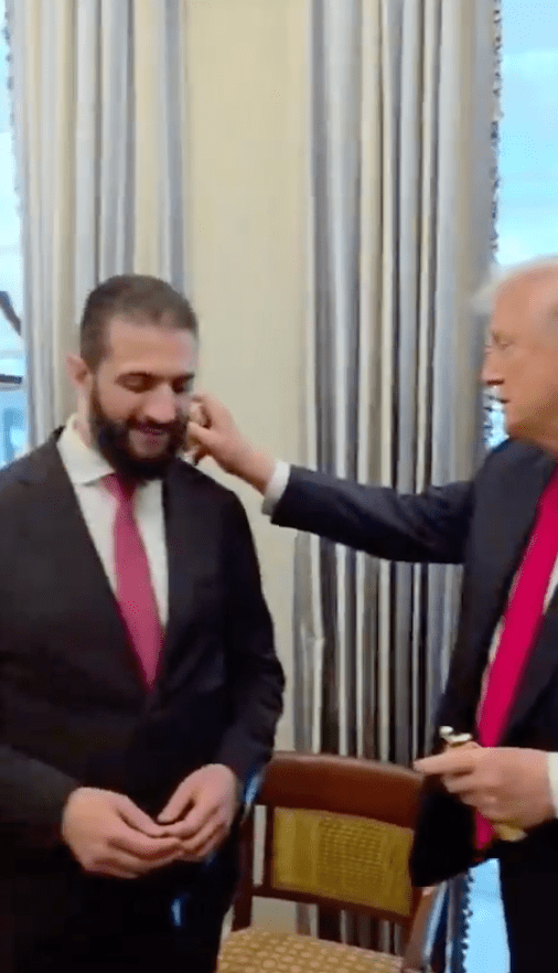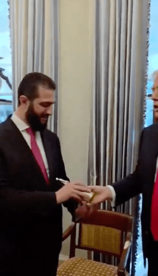現年43歲的沙拉是前“基地”指揮官,曾被美國列入恐怖份子名單、懸賞一千萬美元緝捕,如今卻首度踏入白宮,成為自1946年敘利亞脫離法國殖民以來,首位訪問美國的敘利亞領導人。特朗普在會面中親手送上自家品牌“Trump”的香水作為禮物,甚至當場替沙拉噴上香氣,笑言:“這是最好的香味,另一瓶給你太太?!彪S后他調皮追問:“你有幾個老婆?”