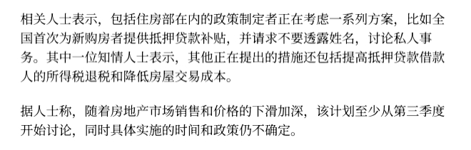 彭博社11月20日發布一篇報道稱,為挽救持續近四年的房地產低迷局面,政策制定者正在考慮推出前所未有的支持方案,其中包括全國層面首次為新購房者提供抵押貸款補貼,并配套提高貸款利息個稅抵扣、降低交易成本等舉措。但是,住房和城鄉建設部未對相關問詢做出回應。