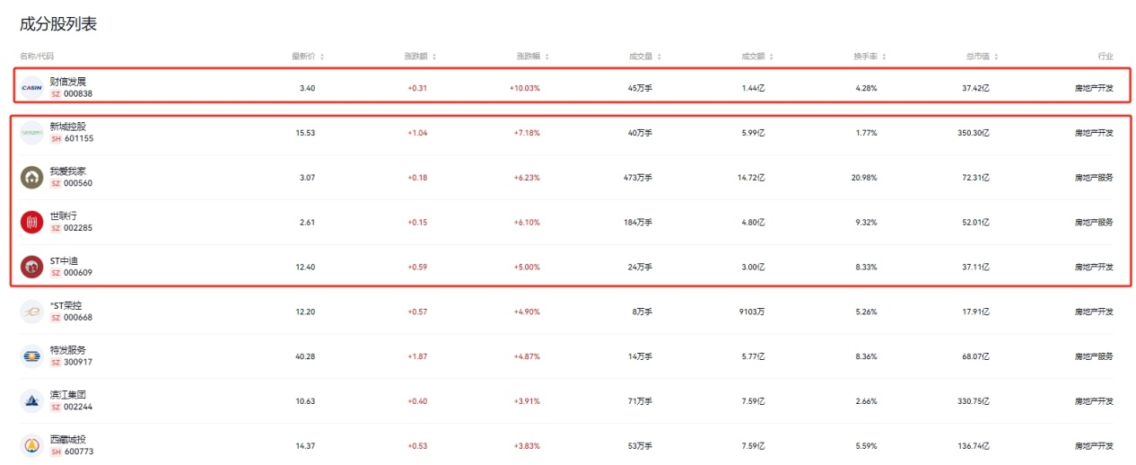 多只房地產個股表現活躍,財信發展(000838.SZ)午后開盤即直線封板,新城控股(601155.SH)、我愛我家(000560.SZ)、世聯行(002285.SZ)等跟漲,漲幅均超5%。此外,ST中迪(000609.SZ)和*ST榮控(000668.SZ)也封于漲停。